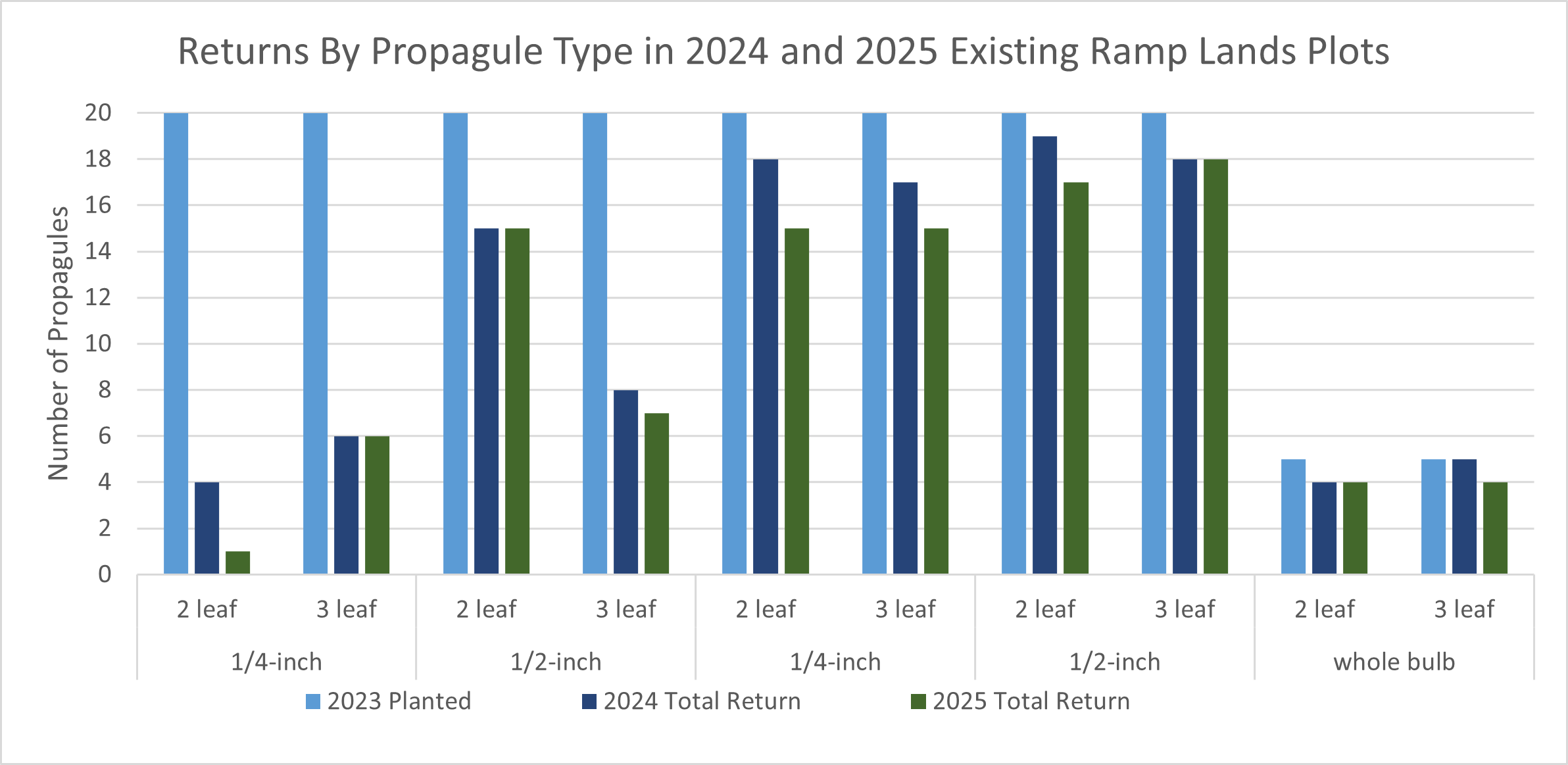 No experimental variables resulted in complete failure. All replants yielded at least some success, suggesting that bulb base replanting could be a viable and successful means of propagating ramps. Success is improved when the following practices are followed: (1) bulbs should be allowed to “size up” during the spring months resulting in larger planting propagules; and (2) propagule (bulb) replant pieces should be 1/2-inch long.